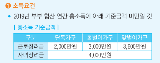 2019년 부부 합산 연간 총소득기준금액 미만이면 신청가능합니다.