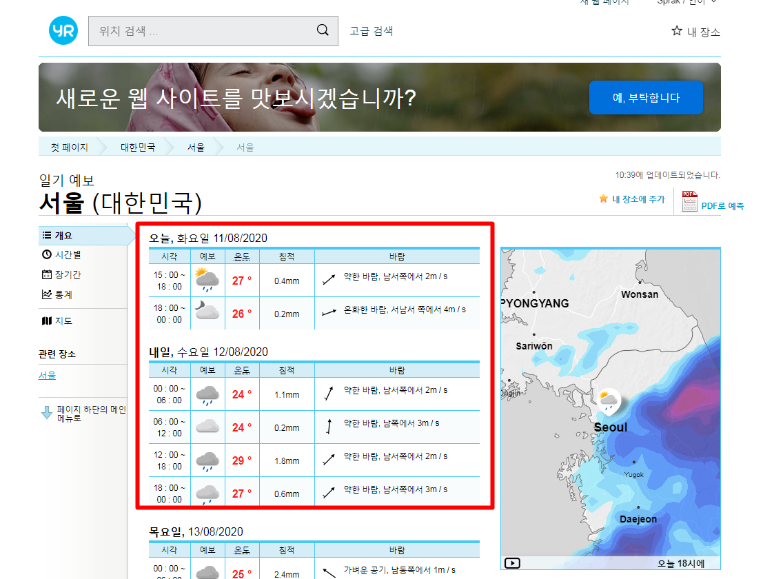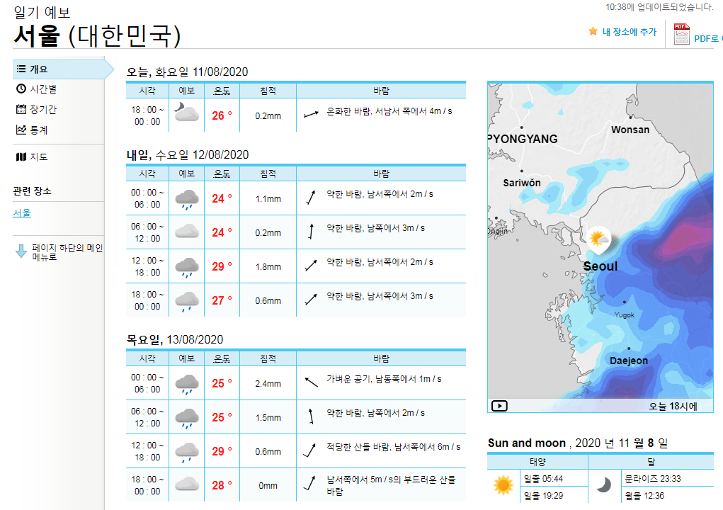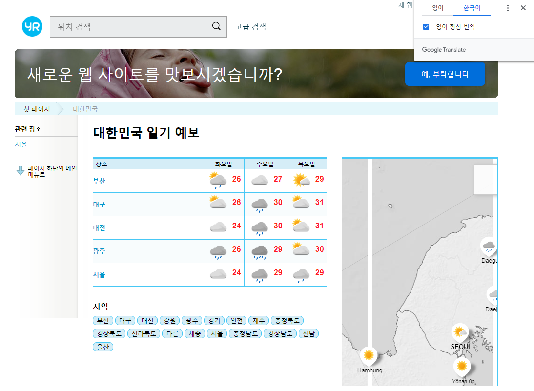구글로 번역한 사이트이지만 날씨 정보를 보는데에는 불편함이 없습니다.