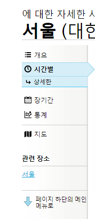 왼쪽메뉴에서 시간별로 선택 , 상세한 (자세한 날씨), 장기간 (중기예보)등을