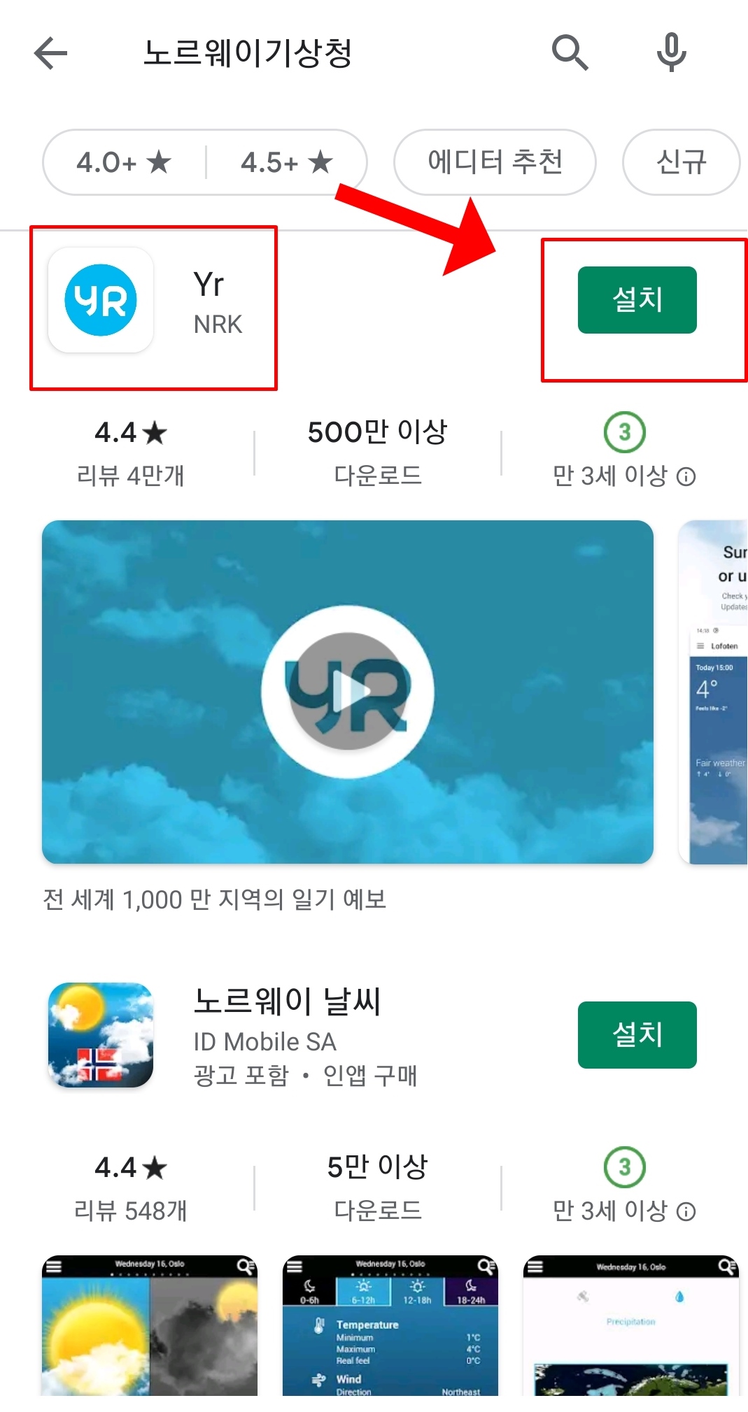 구글플레이스토어에서 노르웨이기상청을 검색해줍니다.