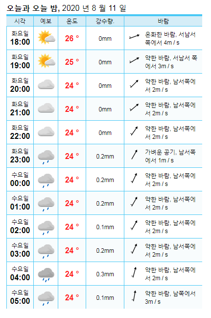 노르웨이 기상청 정보는 시간별로 굉장히 자세하게 날시 예보가 되어 있습니다