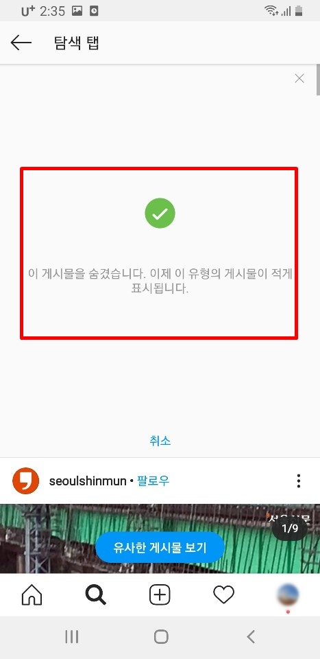 관심없음을 클릭하면 이게시물을 숨겼습니다. 이제 이유형의 게시물이 적게 표시됩니다. 라고 메세지가 뜹니다.