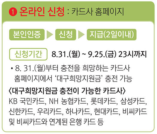 대구 희망지원금은 편리하게 온라인으로 신청하고 신용카드, 체크카드 포인트로 받을수 있습니다