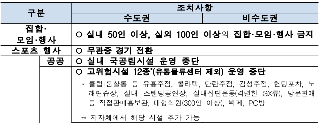 헬스장, 당구장, 스크린골프연습장, 실내체육시설, 배드민턴, 탁구장 대해서는 집합금지 조치를 실시합니다.