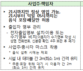 1. 밤9시~익일 오전 5시 음식 포장만 허용