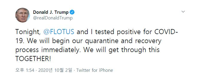 이어 올린 트럼프 트위터에는 " 코로나19 양성판정후 나와 멜라니아는 관저에 격리됐으며