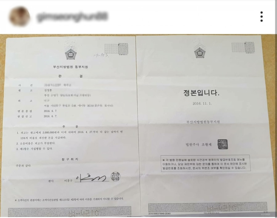 이네티즌은 " 오랫동안 참다 2016년에 민사소소응ㄹ 해서 승소했는데 이때문에 법원에 몇번이나 갔는지 모르겠고