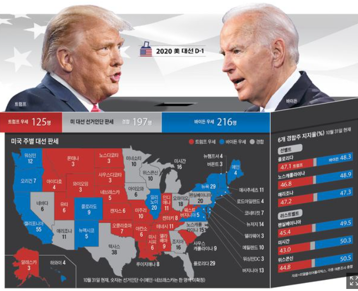 미대선 선거 분석매체 538은 바이든 후보의 승률을 89%로 봤고 , 영국 시사주간지, 이코노미스트는 96%까지