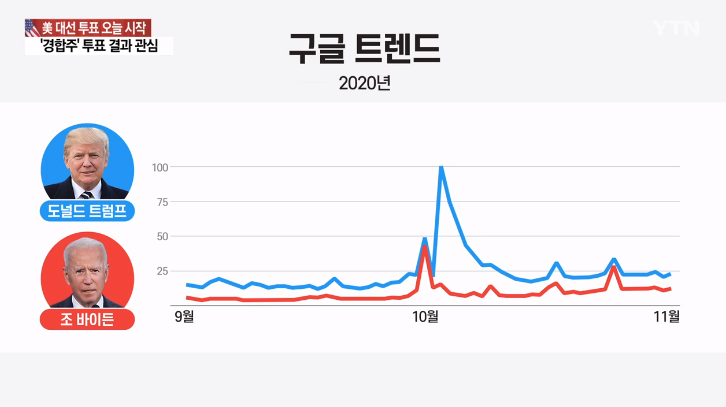 최근 각종 여론조사에선 바이든이 우세를 보였지만 구글트렌드에서는 트럼프에 대한 관심도가 줄곧 높게 나타납니다