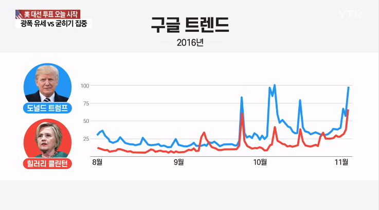주요 언론이 힐러리 당선에 무게를 둘때 구글 트렌드에선 트럼프가 우위였습니다