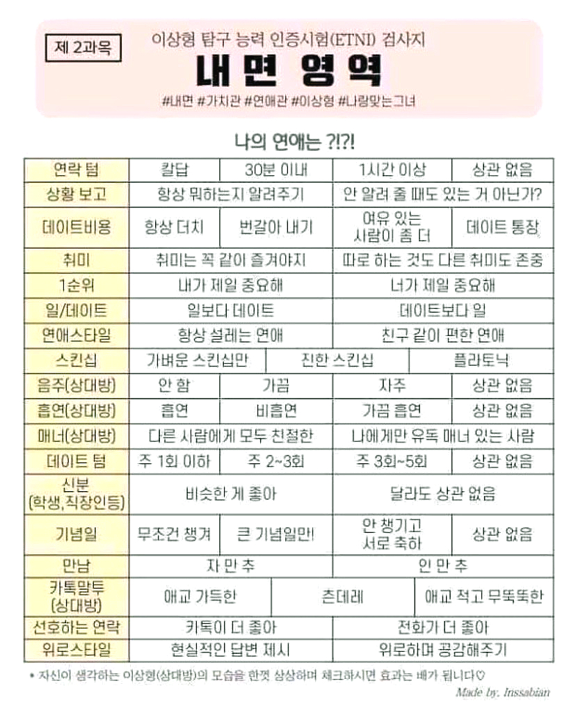 내면영역은 가치관이나 이상형 나랑맞는 그녀등 전반적인 나의 연애 상황을 체크할수 있는 테스트 시험지입니다