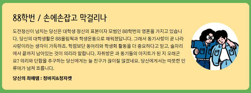 대학내일과 스파오가 함께 만든 찐학번 테스트는 간단한 12가지 문항에 답변하면
